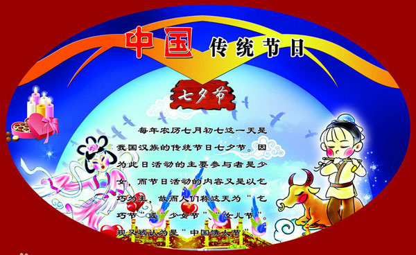 其起源于對自然的崇拜及婦女穿針乞巧,后被賦予了牛郎織女的傳說使其成為象征愛情的節日。現被認為是“中國情人節”。