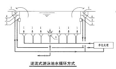 逆流式循環(huán)即泳池內(nèi)的全部循環(huán)水量經(jīng)設(shè)在池底的給水口或給水槽送入池內(nèi),再經(jīng)設(shè)在池壁的溢水槽取回使用過的相應(yīng)體積的水,進(jìn)行凈化(加藥、過濾、加熱及消毒)后再送回池內(nèi)繼續(xù)使用的水流方式。