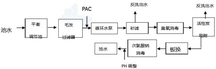 將水中毛發(fā)、大的懸浮物截留住,以免毛發(fā)纏繞泵的葉輪,影響后繼設備運行;出水加入混凝劑后,在管道內(nèi)發(fā)生混合反應,將水中微小懸浮物凝聚,產(chǎn)生礬花經(jīng)高速過濾器后經(jīng)石英砂過濾器截留;后經(jīng)過臭氧消毒,后的水通過活性炭吸附去除水中剩余的臭氧,經(jīng)過換熱器,使水溫達到相應要求;此時加入消毒劑,以殺滅水中細菌,保持一定的余氯量,然后池水重新回到泳池。