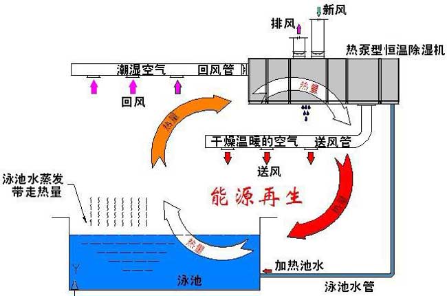 三集一體熱泵的工作原理,簡言之,即是將池水表面蒸發(fā)熱損回收利用,轉(zhuǎn)移入池水和空氣中,彌補(bǔ)池水和空氣熱損,同時(shí)實(shí)現(xiàn)空氣調(diào)節(jié)除濕功能。