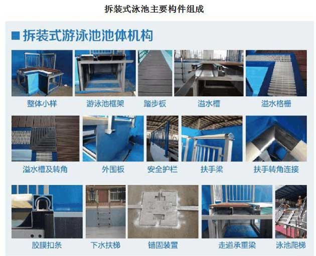 拆裝式游泳池又稱(chēng)活動(dòng)泳池或拼裝式游泳池、拼裝泳池;也是近些年市場(chǎng)涌現(xiàn)出的一種新型游泳池產(chǎn)品。其原理是在工廠完成所有標(biāo)準(zhǔn)構(gòu)件的定制生產(chǎn)、采用現(xiàn)場(chǎng)拼裝作業(yè)方式完成各種規(guī)格游泳池設(shè)施的組裝建設(shè)。拆裝式游泳池可以根據(jù)用戶使用需求快速安裝于大多數(shù)符合要求的簡(jiǎn)單平整場(chǎng)地、相對(duì)于普通土建游泳池而言具有顯著的場(chǎng)地適應(yīng)性和反復(fù)安裝拆卸特性,故命名為拆裝式游泳池。按照國(guó)家標(biāo)準(zhǔn),拆裝式游泳池應(yīng)該能夠提供普通游泳場(chǎng)館的所有訓(xùn)練與比賽功能要求。