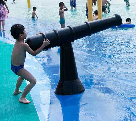 水炮上有一個機(jī)關(guān),按下去就會射出一條長長的水線。深受大小朋友歡迎的戲水設(shè)備。
